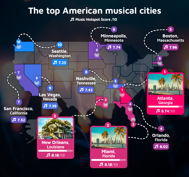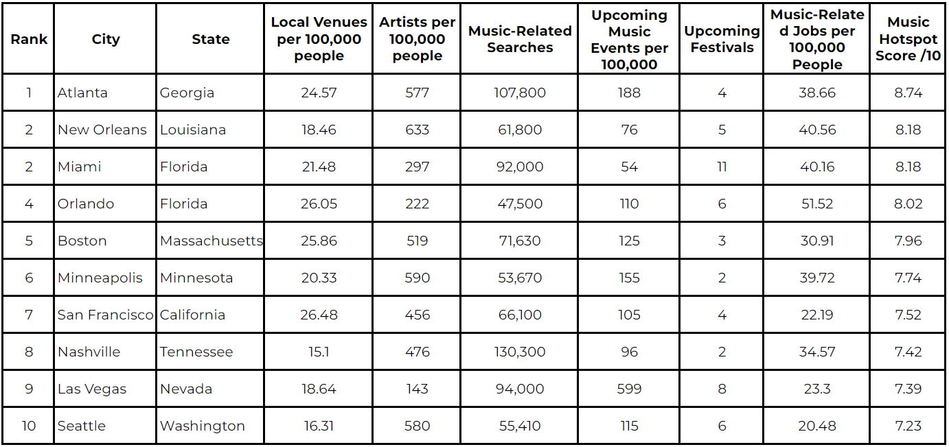 Atlanta tops the ranking with an impressive music hotspot score of 8.74/10, followed by New Orleans and Miami in joint second place, and Orlando (the second Florida city in the top 10) close behind. Overall, the results reveal a strong southern influence, as four of the top five cities are located in the Southeast, where music culture is deeply ingrained in everyday life.