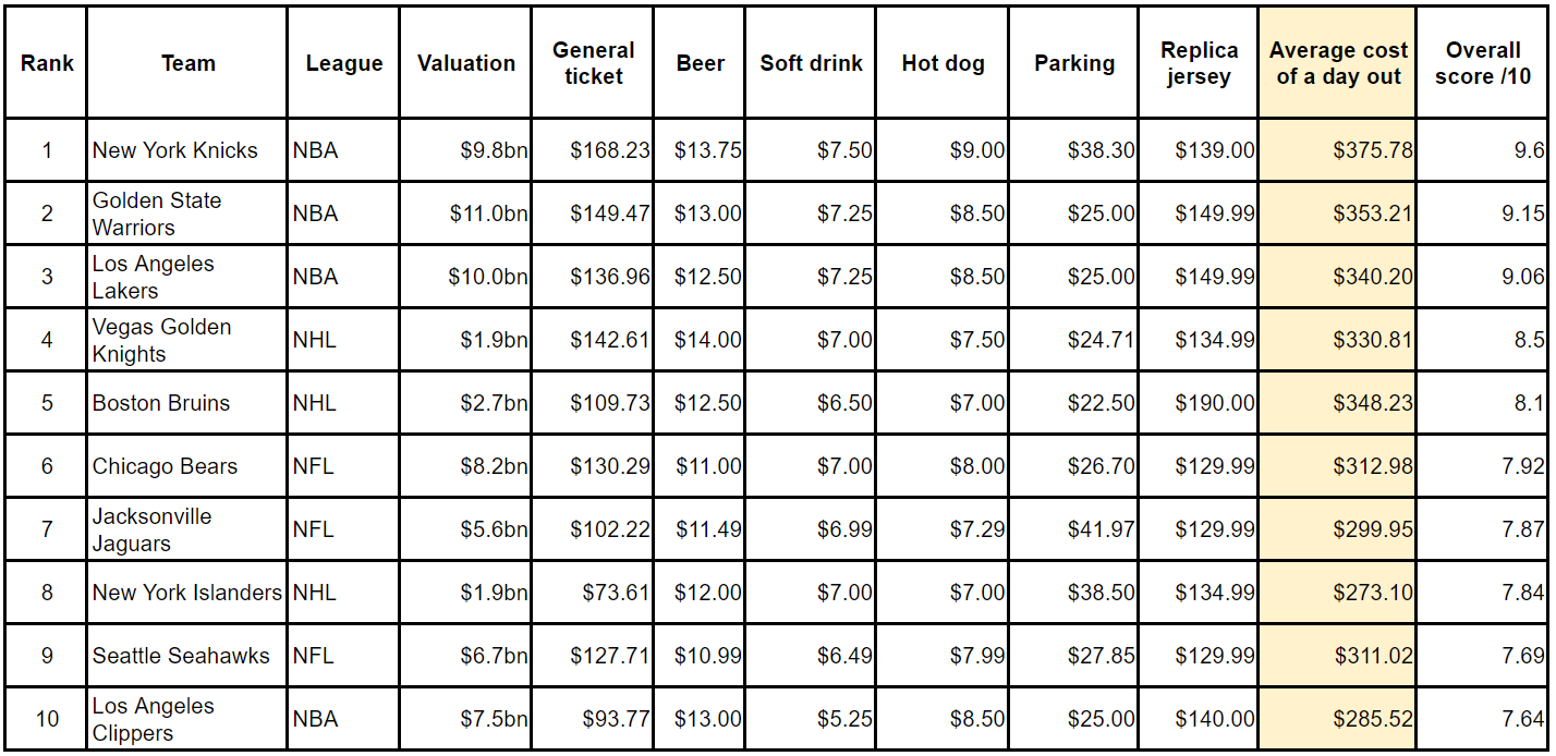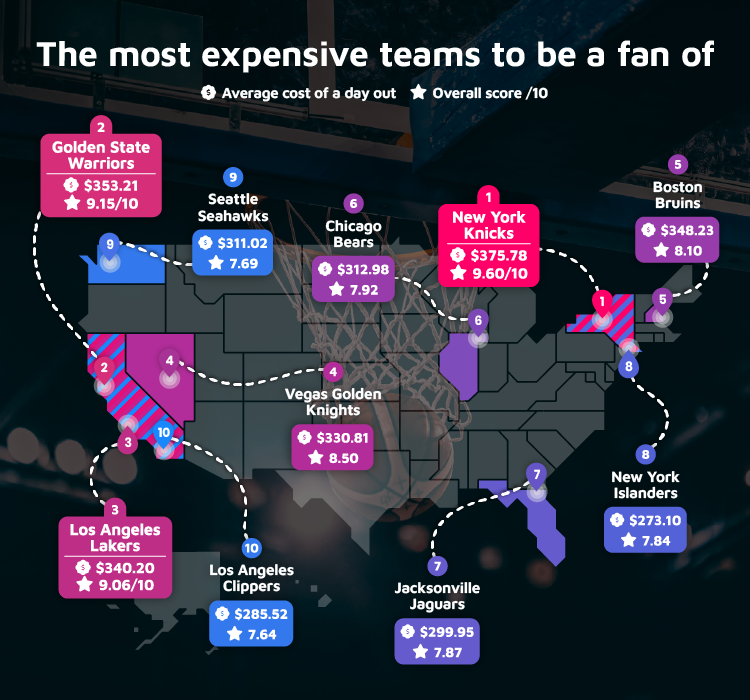 The New York Knicks top the ranking with a cost of being a fan score of 9.6/10, followed by fellow basketball teams the Golden State Warriors and the Los Angeles Lakers in second and third place, respectively. Overall, the results show a trend towards clubs in New York and Los Angeles being especially expensive for fans, as four franchises in these cities feature in the top ten.