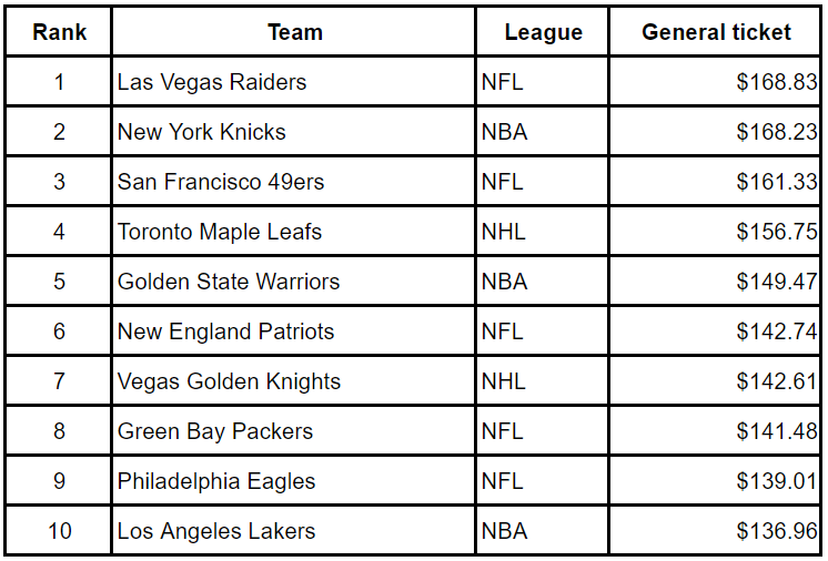 1. Las Vegas Raiders: General ticket cost of $168.83