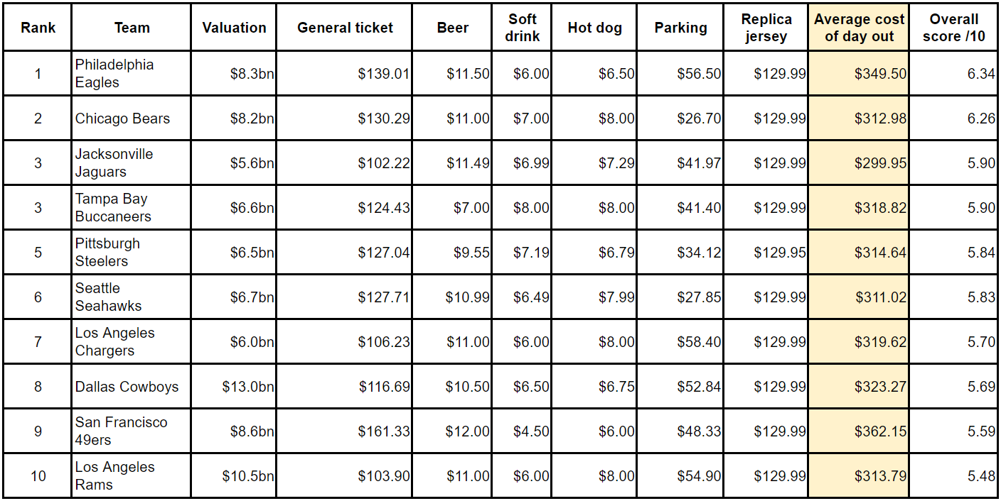 It has been 40 years since the Bears won a Super Bowl, but that doesn’t stop them from being one of the most valuable teams in the league ($8.2 billion). The price of a hot dog is especially high in Chicago, with the price of $8 per dog being the joint highest nationally.