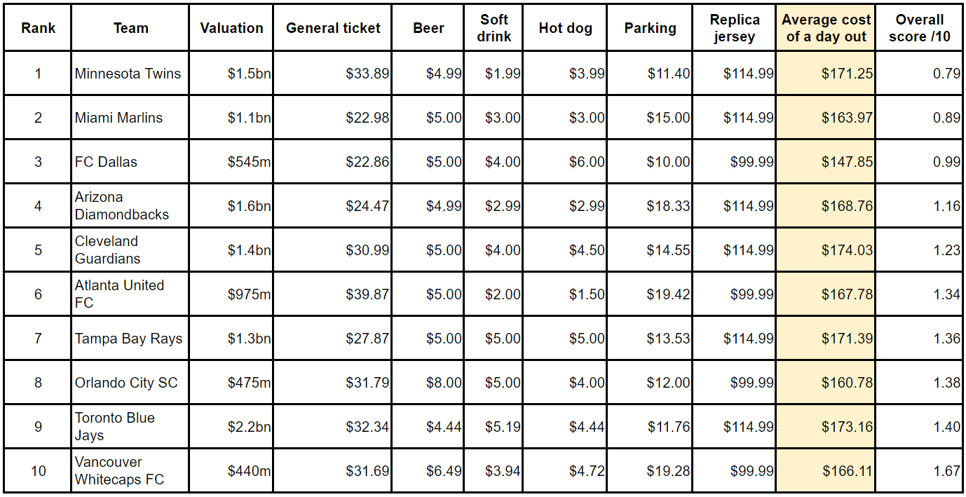 Affordable tickets ($33.89) and standard-priced jerseys also help make the Twins the best-value option for supporters across all leagues.